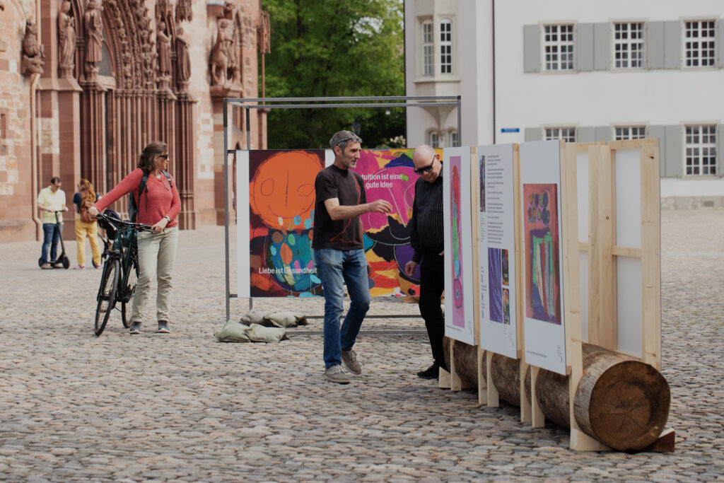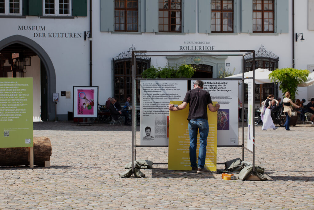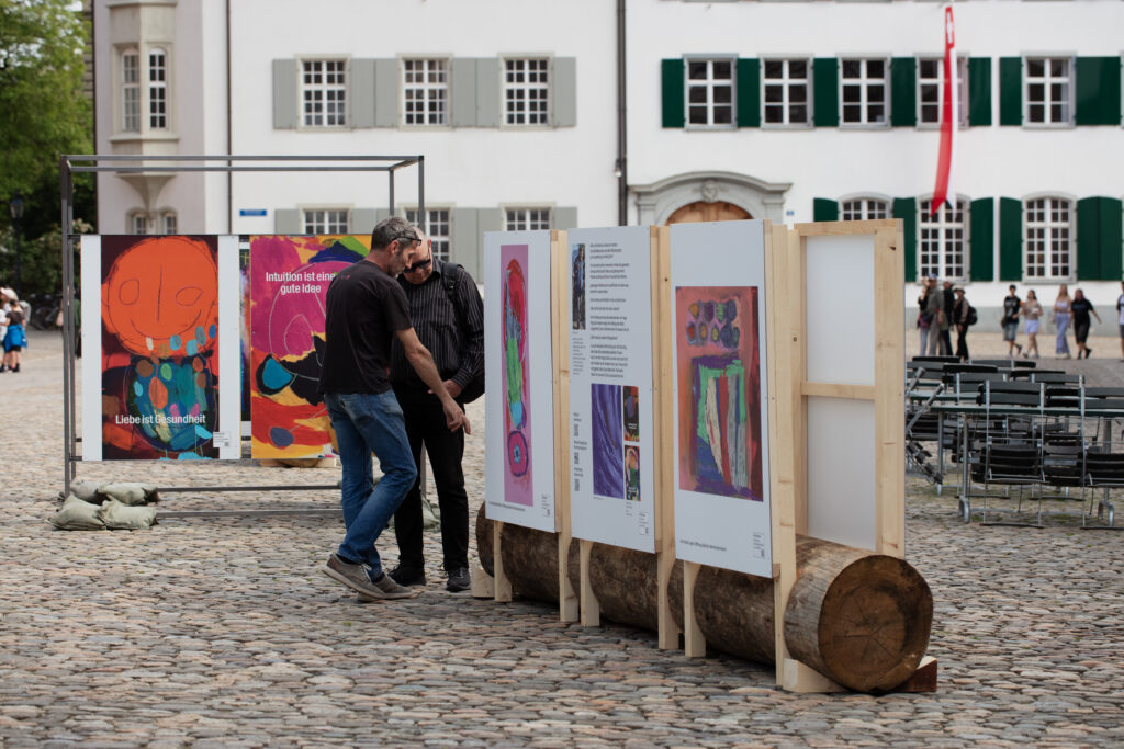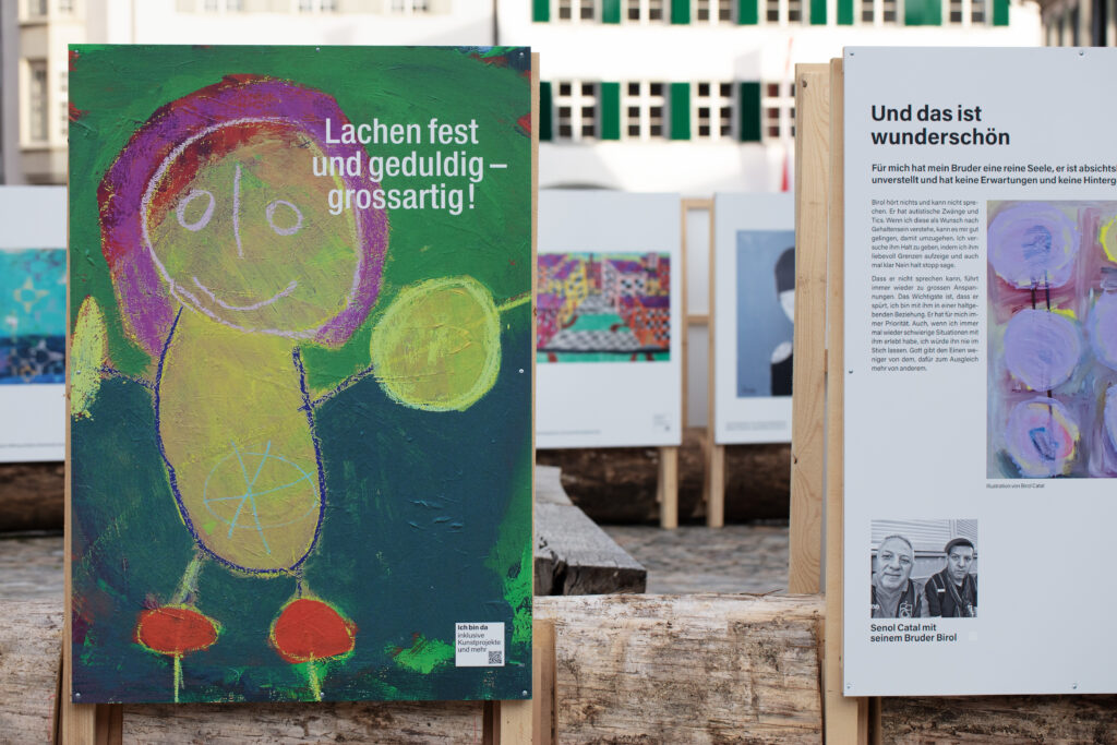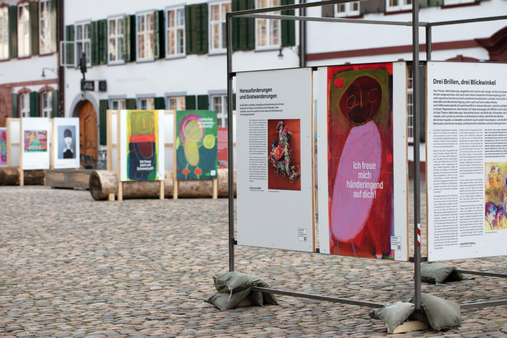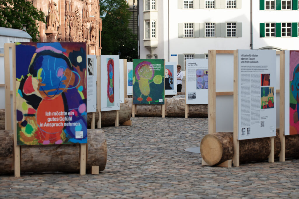 Eindrücke von der Ausstellung „Der Mensch macht glücklich“. Sie fand im Rahmen der nationalen Aktionstage für Behindertenrechte den ganzen Mai 2024 auf dem Münsterplatz Basel statt.