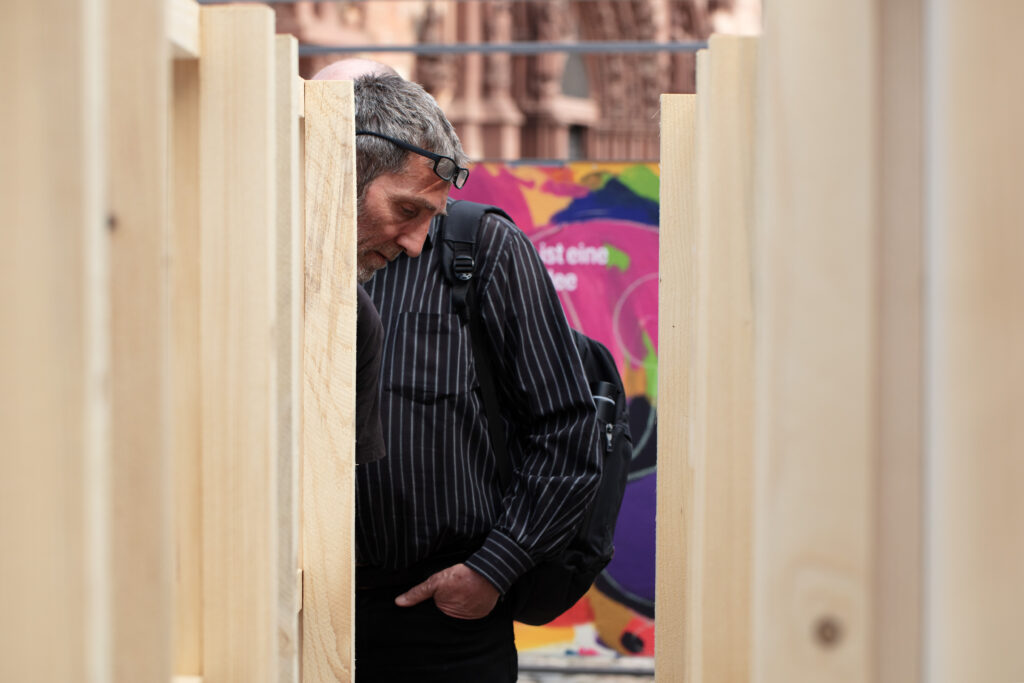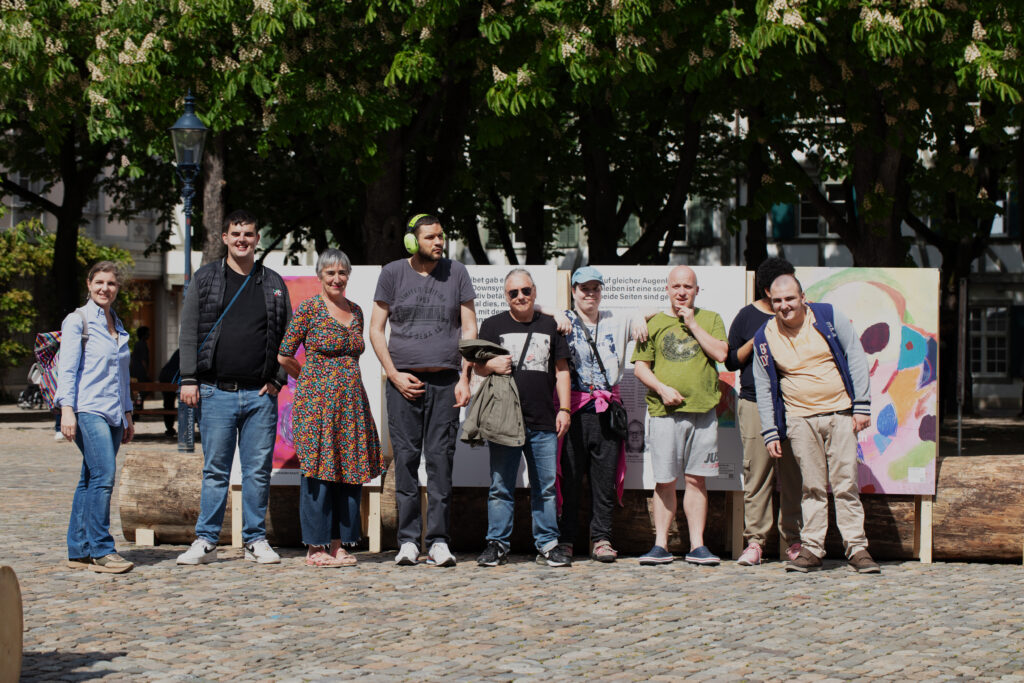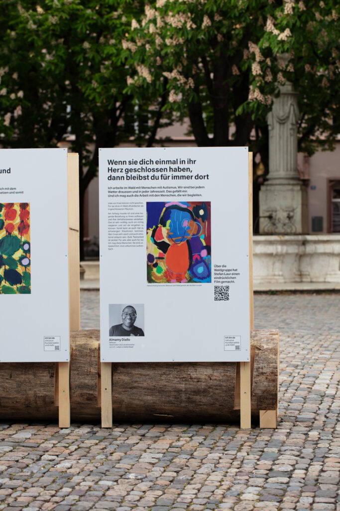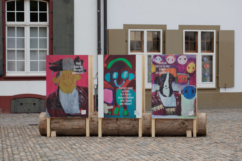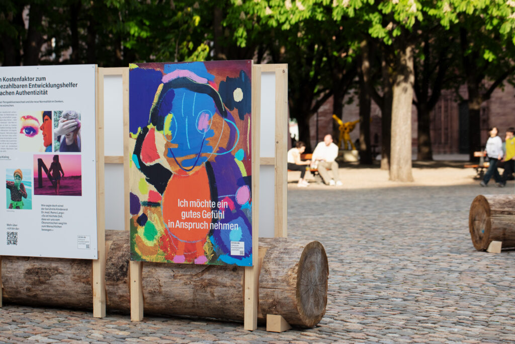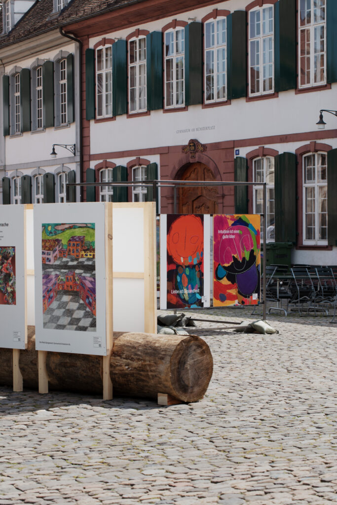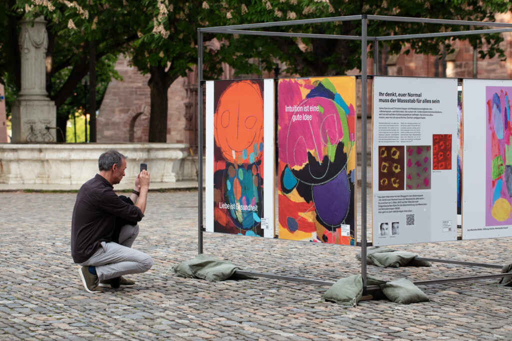 Eindrücke von der Ausstellung „Der Mensch macht glücklich“. Sie fand im Rahmen der nationalen Aktionstage für Behindertenrechte den ganzen Mai 2024 auf dem Münsterplatz Basel statt.
